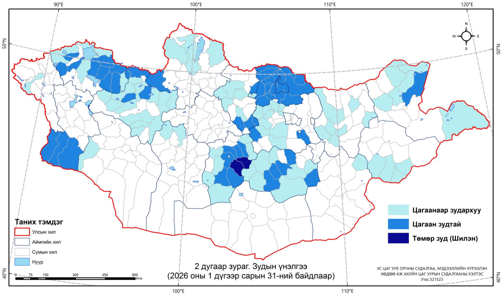 Баян-Өлгийн Сагсай, Увсын Бөхмөрөн, Сагил, Давст, Тэс, Наранбулаг, Зүүнхангай, Завханы Баянхайрхан, Сонгино, Түдэвтэй, Ургамал, Завханмандал, Эрдэнэхайрхан, Тэлмэн, Тосонцэнгэл, Сантмаргац, Их-Уул, Алдархаан, Цагаанхайрхан, Цагаанчулуут, Отгон, Говь-Алтайн Тонхил, Хөвсгөлийн Ренчинлхүмбэ, Алаг-Эрдэнэ, Улаан-Уул, Цагаан-Үүр, Баянхонгорын Гурванбулаг, Жаргалант, Булганы Баян-Агт, Хутаг-Өндөр, Бугат, Хишиг-Өндөр, Сайхан, Орхоны Жаргалант, Баян-Өндөр сумд буюу нийт 16 аймаг 77 сумын нутгаар цагаанаар зудархуу нөхцөлтэй байна.