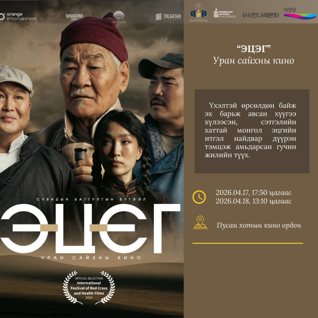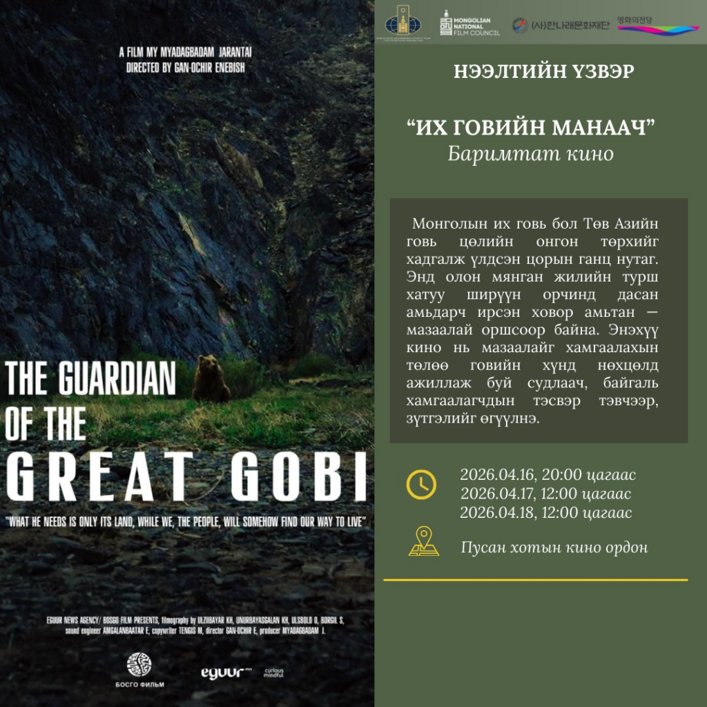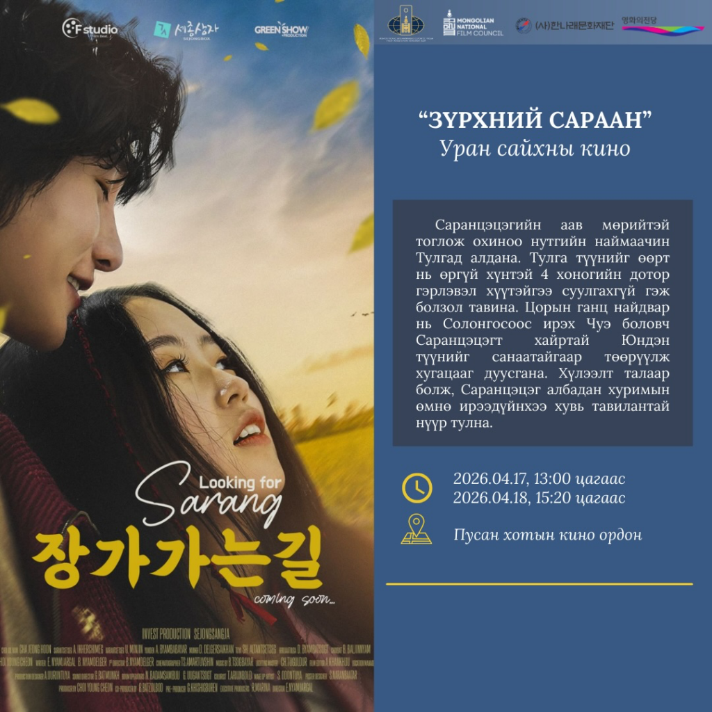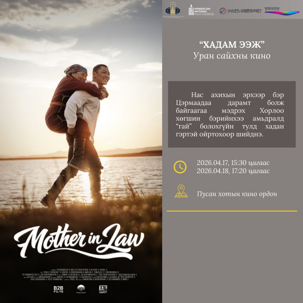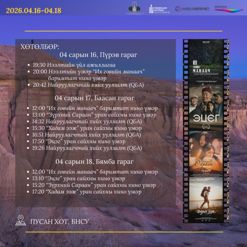 Соёл, спорт, аялал жуулчлал, залуучуудын яамны харьяа Кино урлагийн зөвлөл нь БНСУ-ын Ханнарэ Соёлын сан, Монгол Улсаас БНСУ-ын Пусан хотод суугаа Консулын газрын дэмжлэгтэйгээр “МОНГОЛ КИНО ӨДӨРЛӨГ” арга хэмжээг гурав дахь жилдээ Пусан хотын кино ордонд 2026 оны дөрөвдүгээр сарын 16-18-ны өдрүүдэд зохион байгуулах гэж байна.