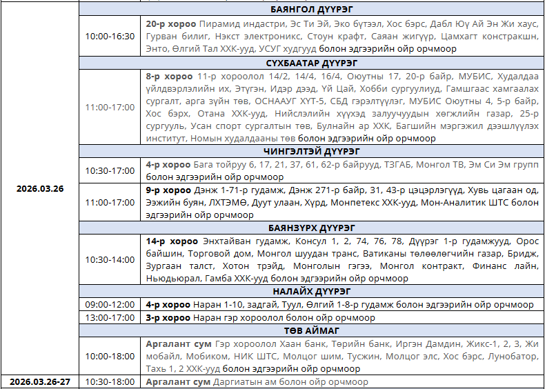 Өнөөдөр буюу 2026 оны гуравдугаар сарын 25-ны Лхагва гарагт цахилгаан шугам сүлжээнд хийх засварын хуваарийг танилцуулж байна.