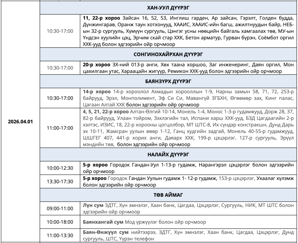 Өнөөдөр буюу 2026 оны дөрөвдүгээр сарын 1 Лхагва гарагт цахилгаан шугам сүлжээнд хийх засварын хуваарийг танилцуулж байна.