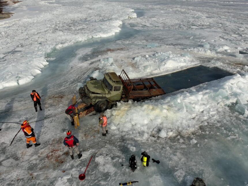 Тус автомашин нь 23 метрийн гүнд живсэн байсан бөгөөд 10м урттай, 3.5м өргөнтэйгээр мөс гудамлаж, эргээс 90 метрийн зайнаас татан гаргасан байна.