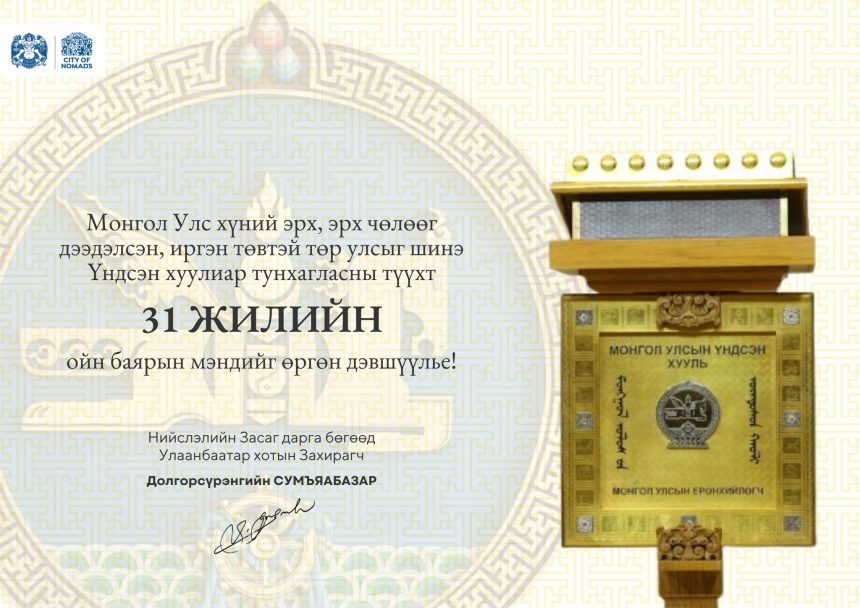 Нийгмийн өөрчлөлт шинэчлэлийг соргогоор мэдэрч, ардчилсан Монгол Улсыг байгуулах 31 жилийн өмнөх зорилтыг хөхиүлэн дэмжиж, хамтран бүтээлцэж буй эрхэм Танд талархал илэрхийлж, Үндсэн хуулийн өдрийн баярын мэндийг хүргэе.