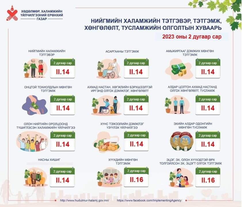 Нийгмийн халамжийн тэтгэвэр, тэтгэмж, хөнгөлөлт, тусламжийн хоёрдугаар сарын олголтын хуваарийг танилцуулж байна.