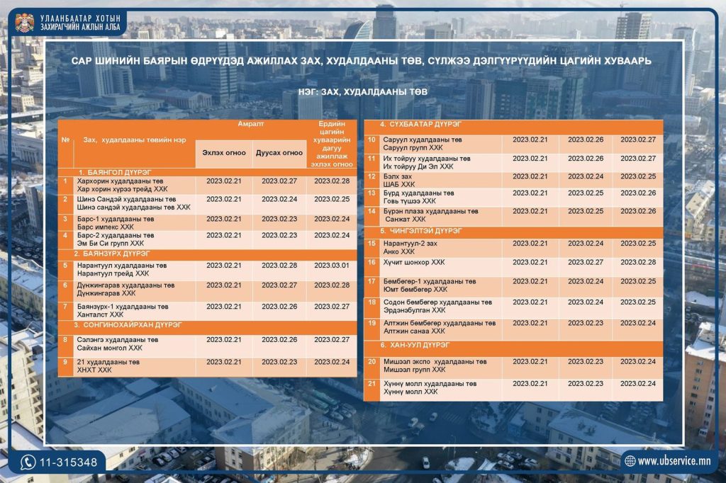 Сар шинийн баяраар зах худалдааны төвүүд хоёрдугаар сарын 21-нээс амрах хуваарьтай байна.