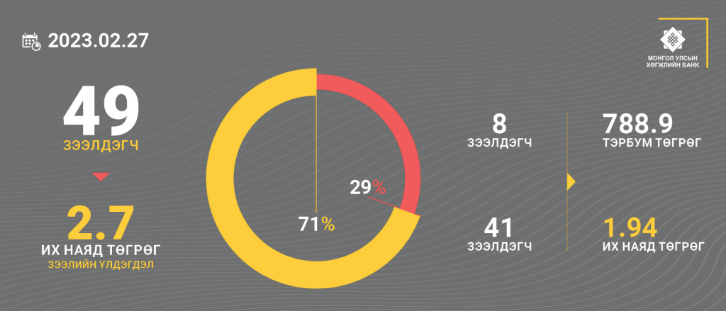Монгол Улсын Хөгжлийн банк 2022 оны 1 дүгээр сарын 20-ны өдрөөс хойш 2023 оны 2 дугаар сарын 27-ны өдрийг хүртэлх хугацаанд нийт 1,113.6 тэрбум төгрөгийн зээл барагдууллаа. Үүнээс 757.7 тэрбум төгрөгийг бэлэн мөнгөөр, 175.4 тэрбум төгрөгийг өмчлөх бусад үл хөдлөх хөрөнгөөр, 180.6 тэрбум төгрөгийг үнэт цаасаар төвлөрүүлээд байгаа аж. Нийт 19 төсөлд олгосон зээл хаагдсанаас 14 зээл нь бэлнээр буюу 290.9 тэрбум төгрөгөөр, 4 зээл нь өмчлөх бусад үл хөдлөх хөрөнгөөр, нэг зээл үнэт цаасаар төлөгдөөд байна.