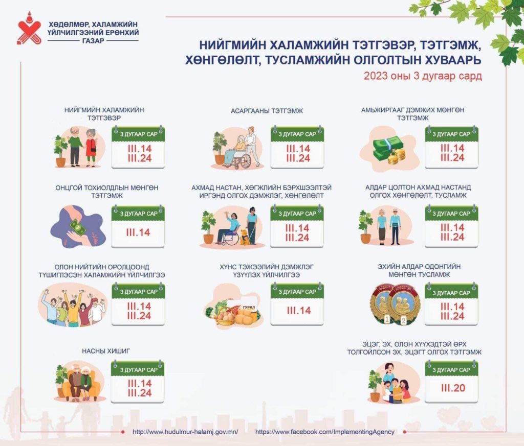 Нийгмийн халамжийн тэтгэвэр, тэтгэмж, хөнгөлөлт, тусламжийн гуравдугаар сарын олголтын хуваарийг танилцуулж байна.