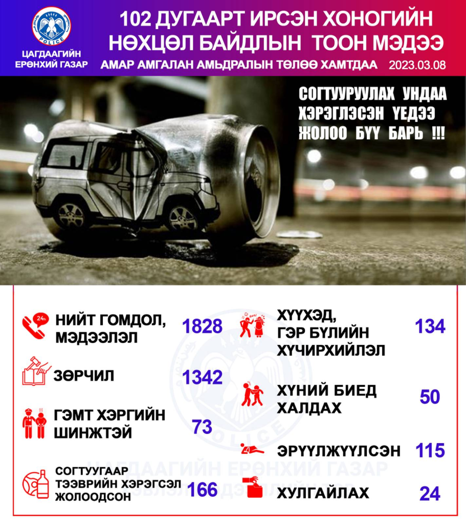 Цагдаагийн байгууллагын 102 тусгай дугаарт 2023 оны гуравдугаар сарын 08-ны өдөр нийт 1828 дуудлага, мэдээлэл бүртгэгдсэнээс зөрчлийн шинжтэй 1342 гэмт хэргийн шинжтэй 73 дуудлага, мэдээлэл байна гэж Цагдаагийн Ерөнхий Газрын Хэвлэл Мэдээллийн Төвөөс мэдээллээ.