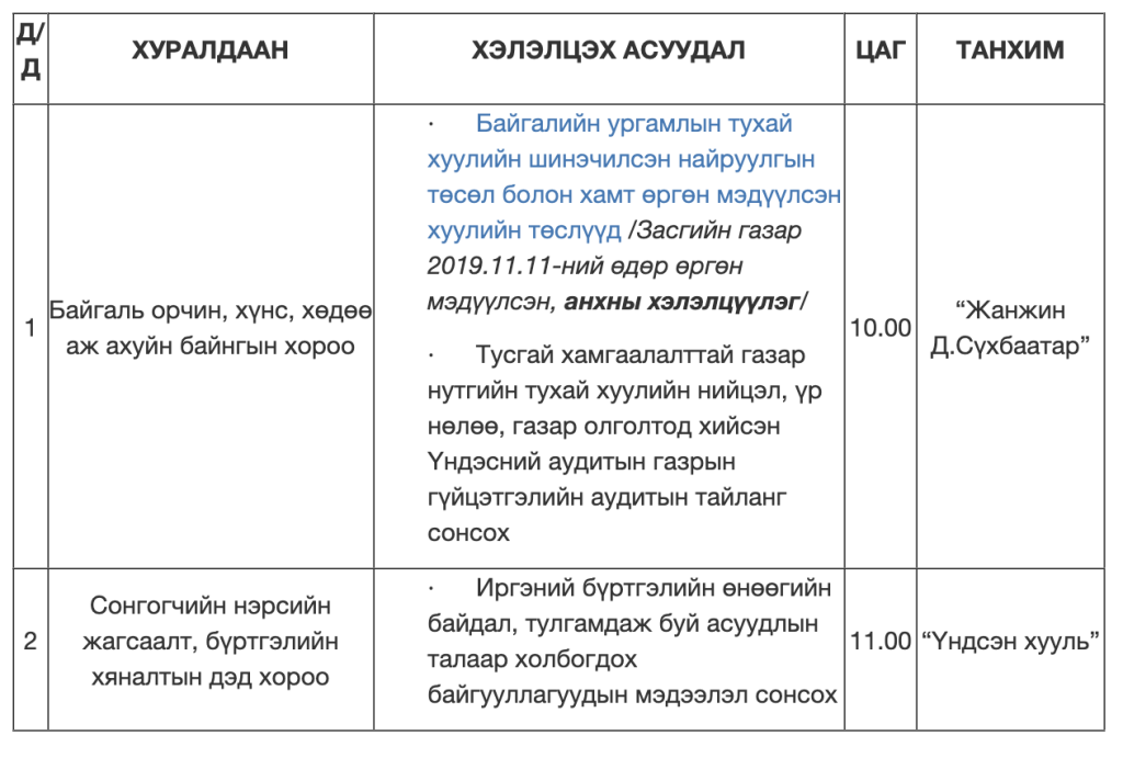 Улсын Их Хурлын байнгын хороодын 2023 оны гуравдугаар сарын 29-ний өдрийн хуралдааны тов, хэлэлцэх асуудлын дарааллыг танилцуулж байна.