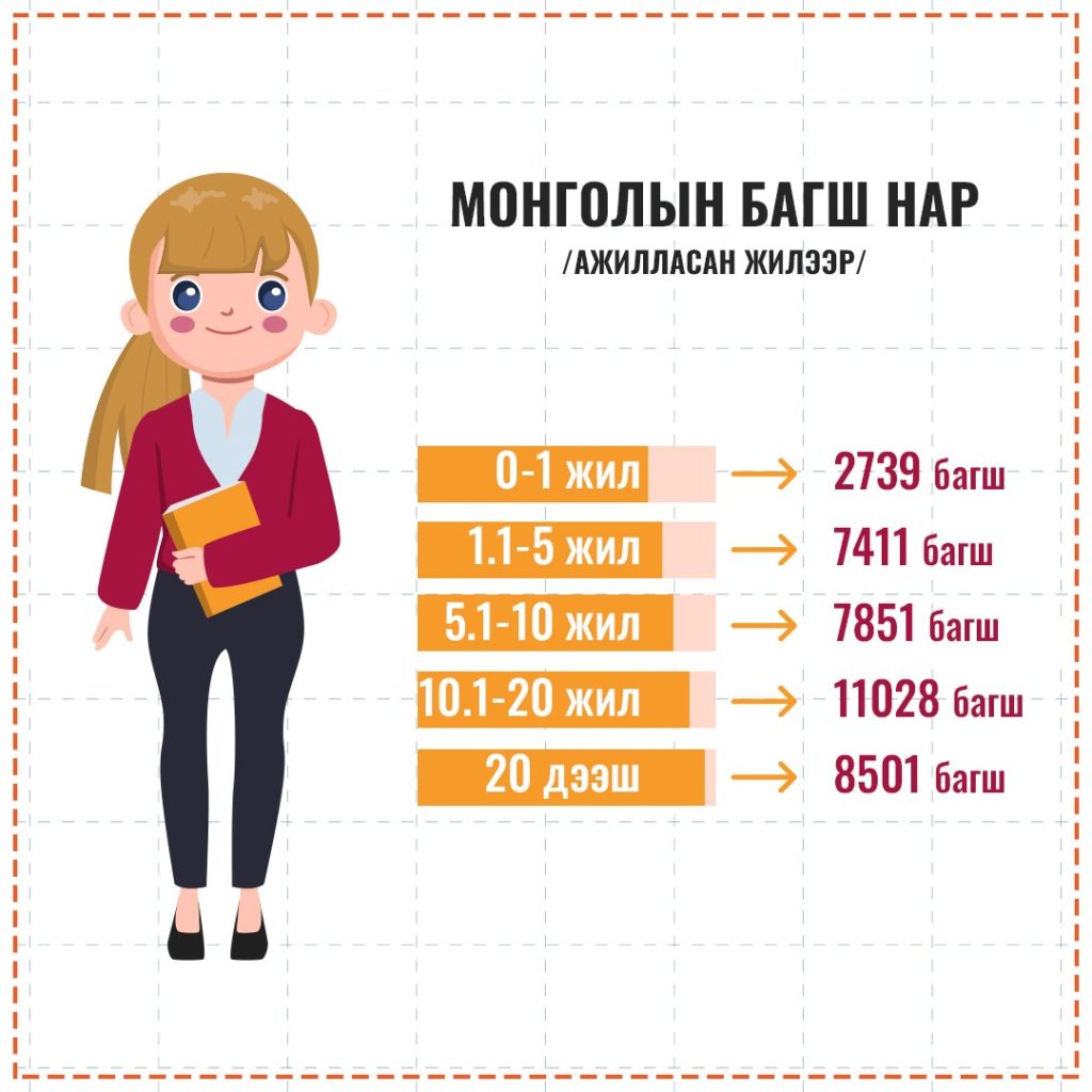 Монгол Улсын багш нарыг нас болон ажилласан жилээр нь ангилсан зурагт хуудаснаас таван хүртэл жил ажиллаж байгаа буюу нэмэгдэл бага авах залуу багш нарын тоог харж болно. Багш нарын 75-аас дээш хувь нь тодорхой нэмэгдэл авдаг туршлагатай багш нар байна. 2022 оны арванхоёрдугаар сарын байдлаар дийлэнх багш нар 1,2-2 сая төгрөгийн цалин авчээ. Гэхдээ энэ мэдээлэлд гүйцэтгэл, үр дүнгийн урамшуулал багтаагүй гэдгийг онцолж байна. Багш нар үндсэн цалингаас гадна цалингийн нэмэгдэл, нэмэгдэл хөлс, гүйцэтгэл үр дүнгийн урамшуулал авдаг. Мөн хичээл сургалтын үйл ажиллагааг сайжруулах, хувьсах зардлыг оновчтой хуваарилах зорилгоор багшийн үйл ажиллагааг дэмжих бусад зардлыг 2022 оноос эхлэн шийдвэрлэж байна. Үүнд эрүүл мэндийн, дата хэрэглээний, хичээл практикийн зэрэг зардал багтдаг.