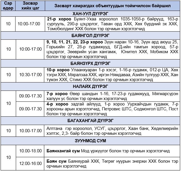 Өнөөдөр буюу дөрөвдүгээр сарын 10-ны даваа гарагт хийх засварын хуваарийг танилцуулж байна. Нийслэлийн таван дүүрэг, Зуунмод суманд цахилгаан хязгаарлах юм. Хэрэглэгчдийг засвар хийх хугацаанд хэрэглээгээ түр зохицуулахыг санууллаа. Дэлгэрэнгүйг энд дарж үзнэ үү.