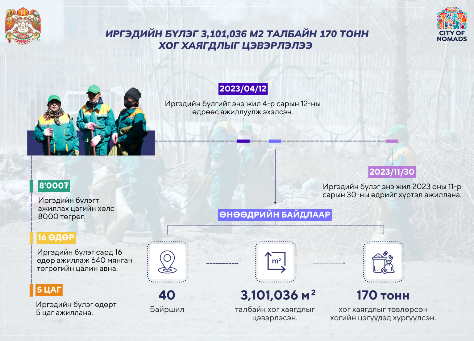 - УБЗАА-ны Орчны бохирдол, хог хаягдлын удирдлагын хэлтсээс сар бүр цэвэрлэх талбайн хуваарь, төлөвлөгөөг батлан, төрийн бус байгууллагууд өдөр тутмын гүйцэтгэлийн чанарт хяналт тавин ажиллаж байна. Иргэдийн бүлэг нь арваннэгдүгээр сарын 30-ныг хүртэл ажиллах юм.