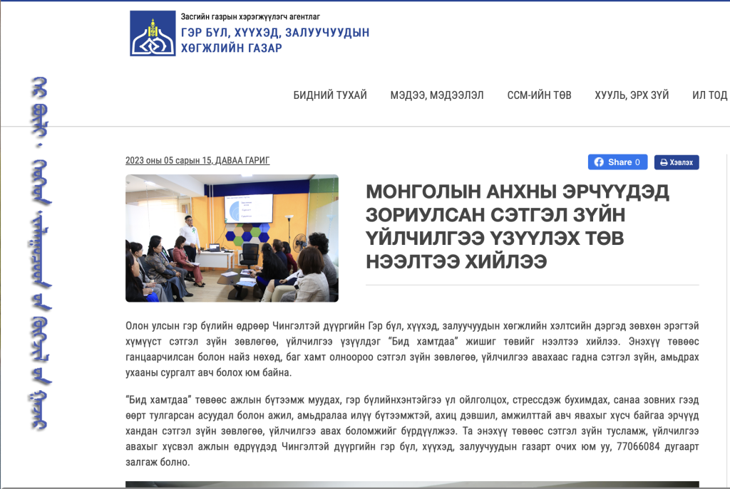 Энэхүү төв нь биечлэн болон утсаар хууль эрх зүй, нийгэм-сэтгэл зүйн зөвлөгөө, мэдээллийг мэргэжлийн нийгмийн ажилтан, сэтгэл зүйч ажлын найман цагаар өгөх зэрэг болно гэсэн мэдээллийг Гэр бүл, хүүхэд, залуучуудын хөгжлийн газар, Чингэлтэй дүүргийн Гэр бүл хүүхэд залуучуудын хөгжлийн хэлтэс гэсэн сошиал хуудсандаа мэдээлэл оруулсан байсан юм. Гэвч тэдний утсаар зөвлөгөө мэдээлэл авах #77066084 гэсэн дугаарын орох ярианы эрх хаагдсан байв.